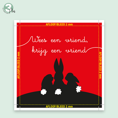 Wij vragen onze klanten om steeds 2 mm afloop (bleed) te voorzien. In Adobe Indesign of -Illustrator is deze afloop gemakkelijk in te geven bij het maken van een "Nieuw document". Bij het exporteren naar een drukklare PDF moet je ervoor zorgen dat de “snijtekens” en “afloop” aangevinkt staan.